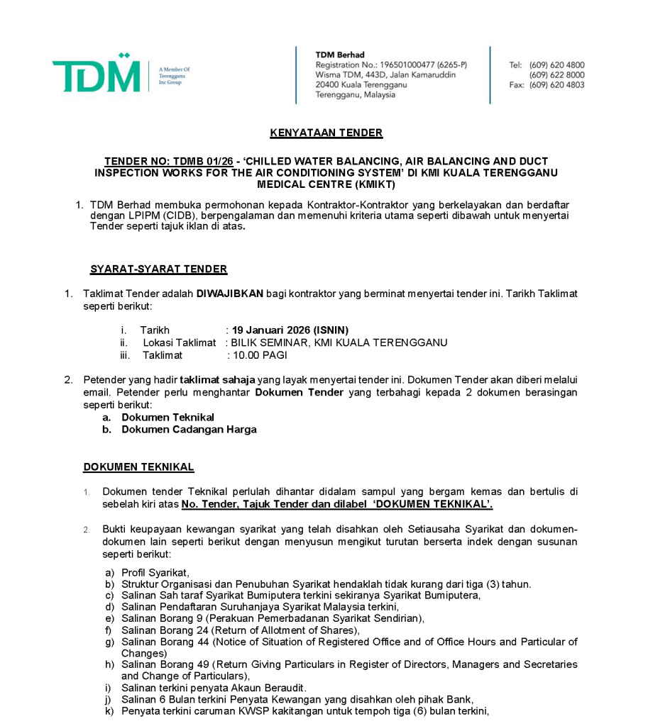 TENDER NO: TDMB 01/26 – ‘CHILLED WATER BALANCING, AIR BALANCING AND DUCT INSPECTION WORKS FOR THE AIR CONDITIONING SYSTEM’ DI KMI KUALA TERENGGANU MEDICAL CENTRE (KMIKT)