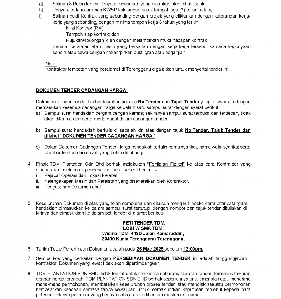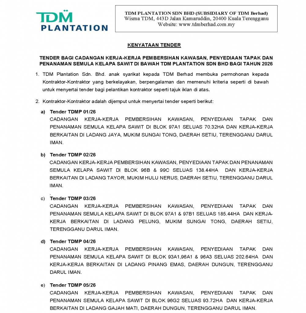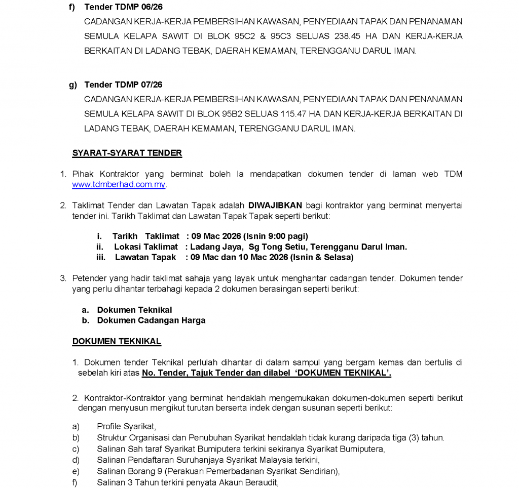 TENDER NO: TDMP 01-07/26 – CADANGAN KERJA-KERJA PEMBERSIHAN KAWASAN, PENYEDIAAN TAPAK DAN PENANAMAN SEMULA KELAPA SAWIT DI BAWAH TDM PLANTATION SDN. BHD. BAGI TAHUN 2026
