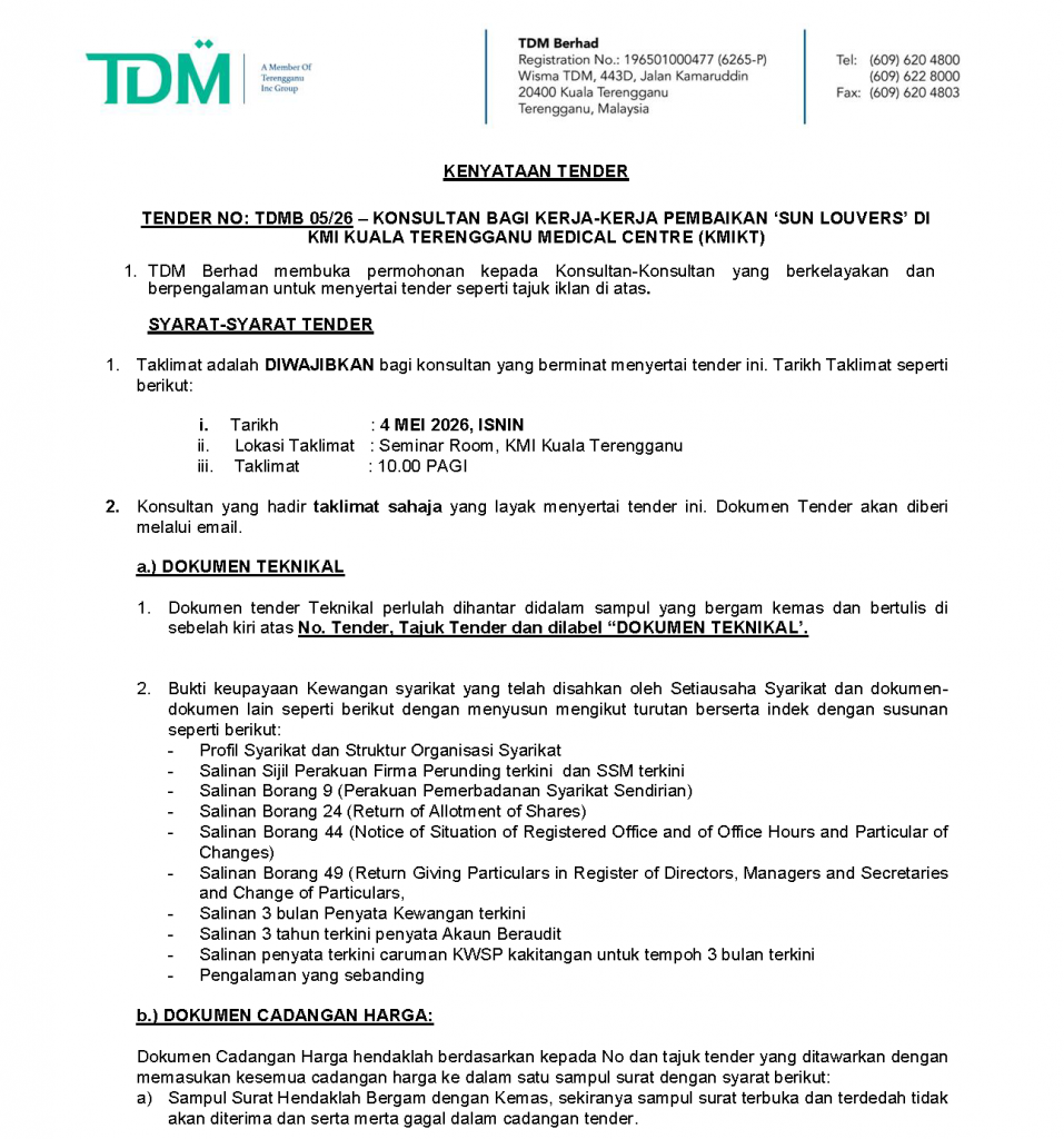 TENDER NO: TDMB 05/26 – KONSULTAN BAGI KERJA-KERJA PEMBAIKAN ‘SUN LOUVERS’ DI KMI KUALA TERENGGANU MEDICAL CENTRE (KMIKT)